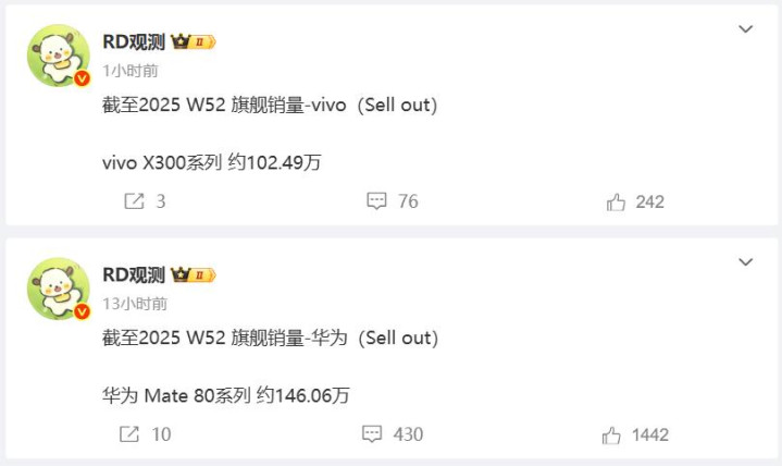华为Mate80系列、vivo X300系列,截至2025 W52的销量分布约为146.06万台,102.49万台。