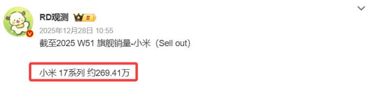 根据该博主提供的数据,同期的国产旗舰中,销量表现最好的是小米17系列,马上要达到300万台(目前数据是约269.41万台),和iPhone17系列的差距非常大。