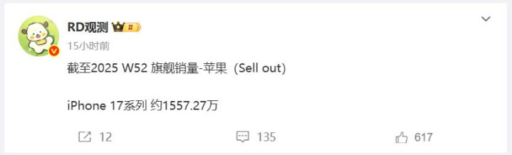近期有博主公布了截至2025年第52周iPhone 17系列在中国市场的销量数据,显示iPhone17系列的累计销量,已经达到了1557.27万台。