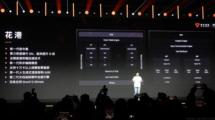 当然,对于游戏玩家来说,大家最关注的部分可能还是“花港”在游戏相关方面的设计。摩尔线程公布的信息表明,“花港”是他们第一代使用了AI生成式渲染架构(AGR)的GPU设计。与此同时,它还迭代了光线追踪硬件加速引擎,让光追速度相比上代架构(平湖)提升了5-6倍,且完美支持Windows系统和DX12.2 API。